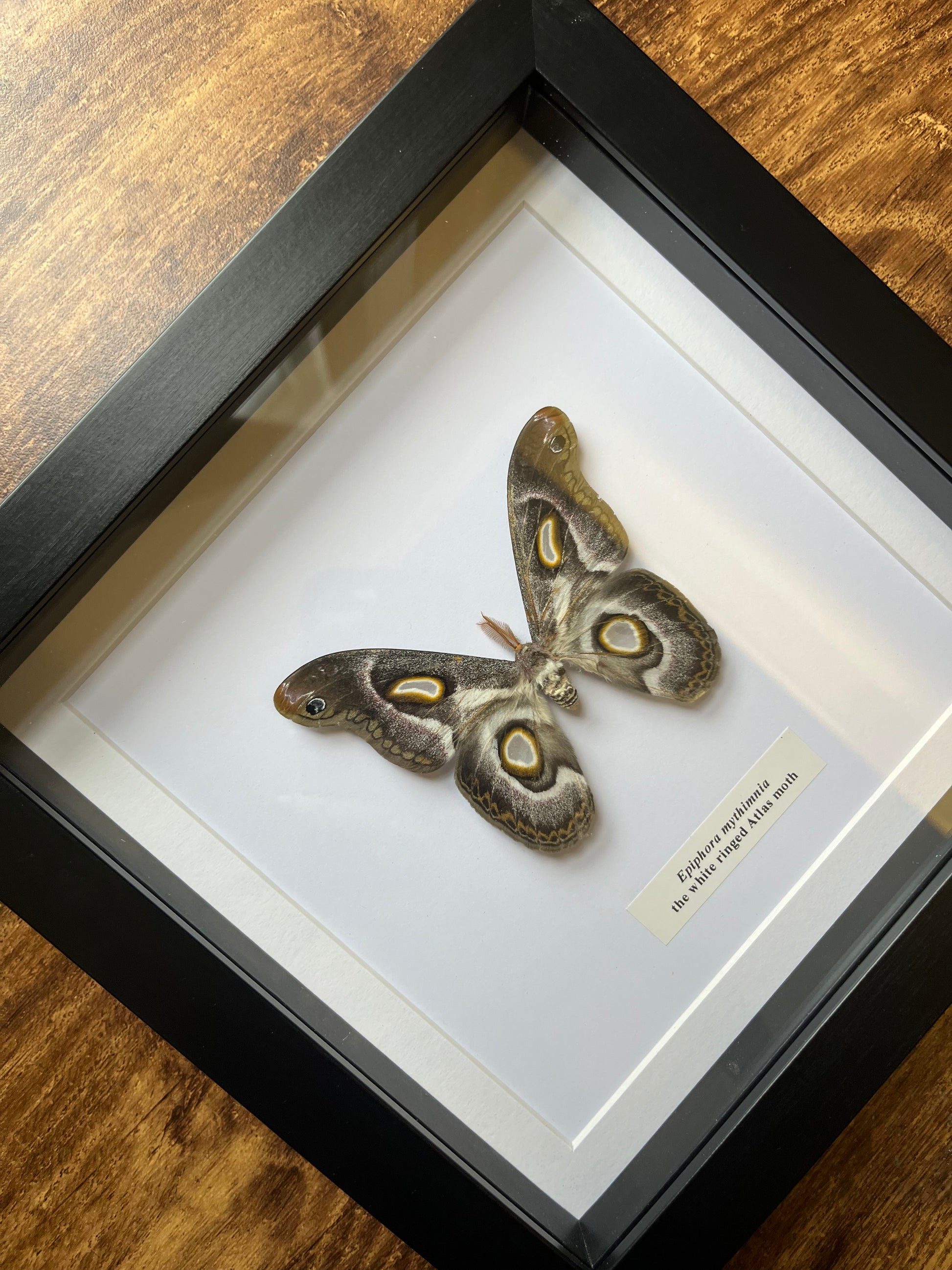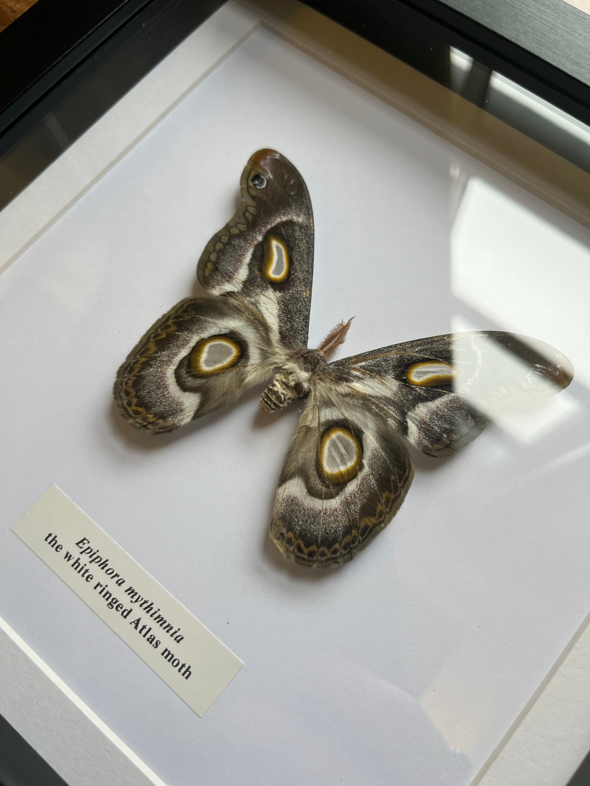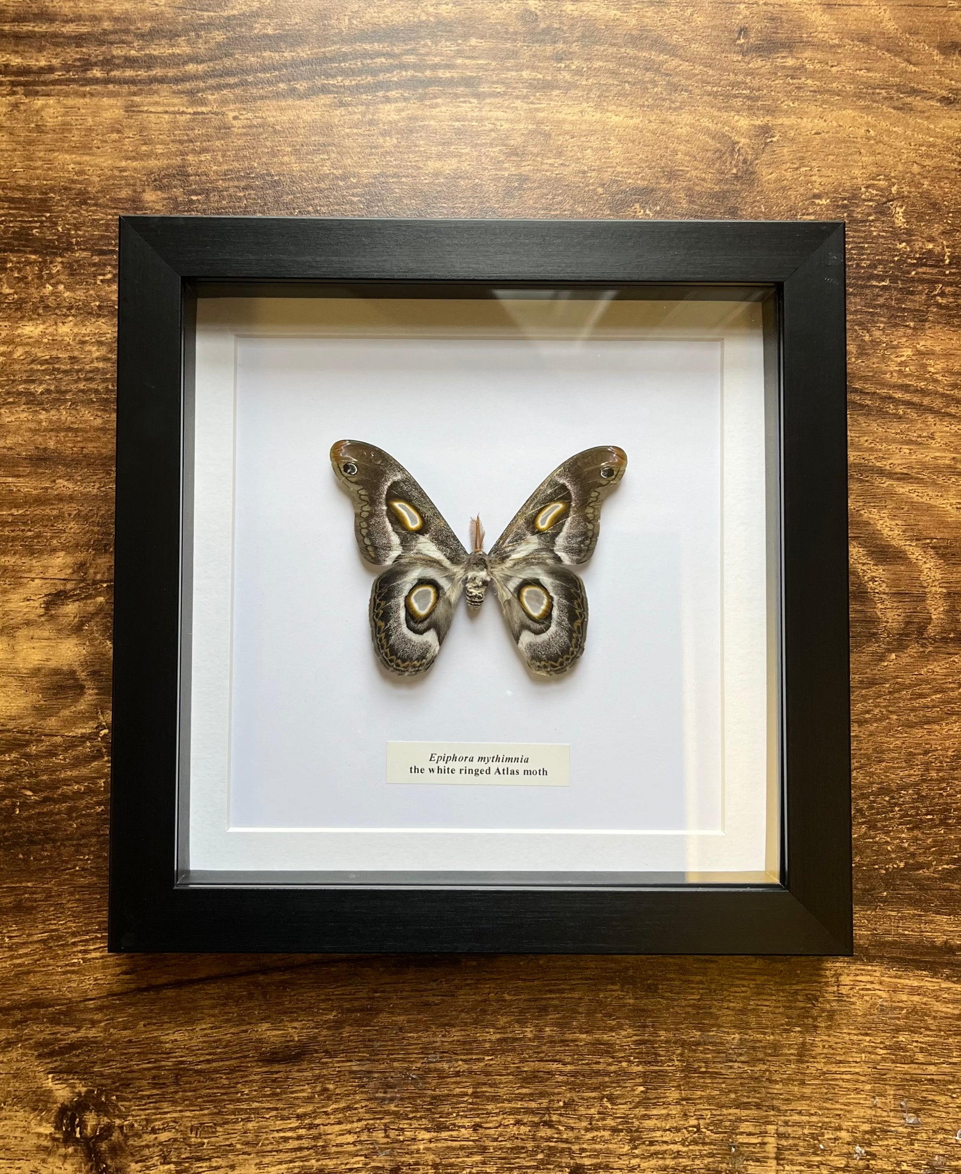 The species is pinned and preserved in a 24x24cm black frame a white card background.
