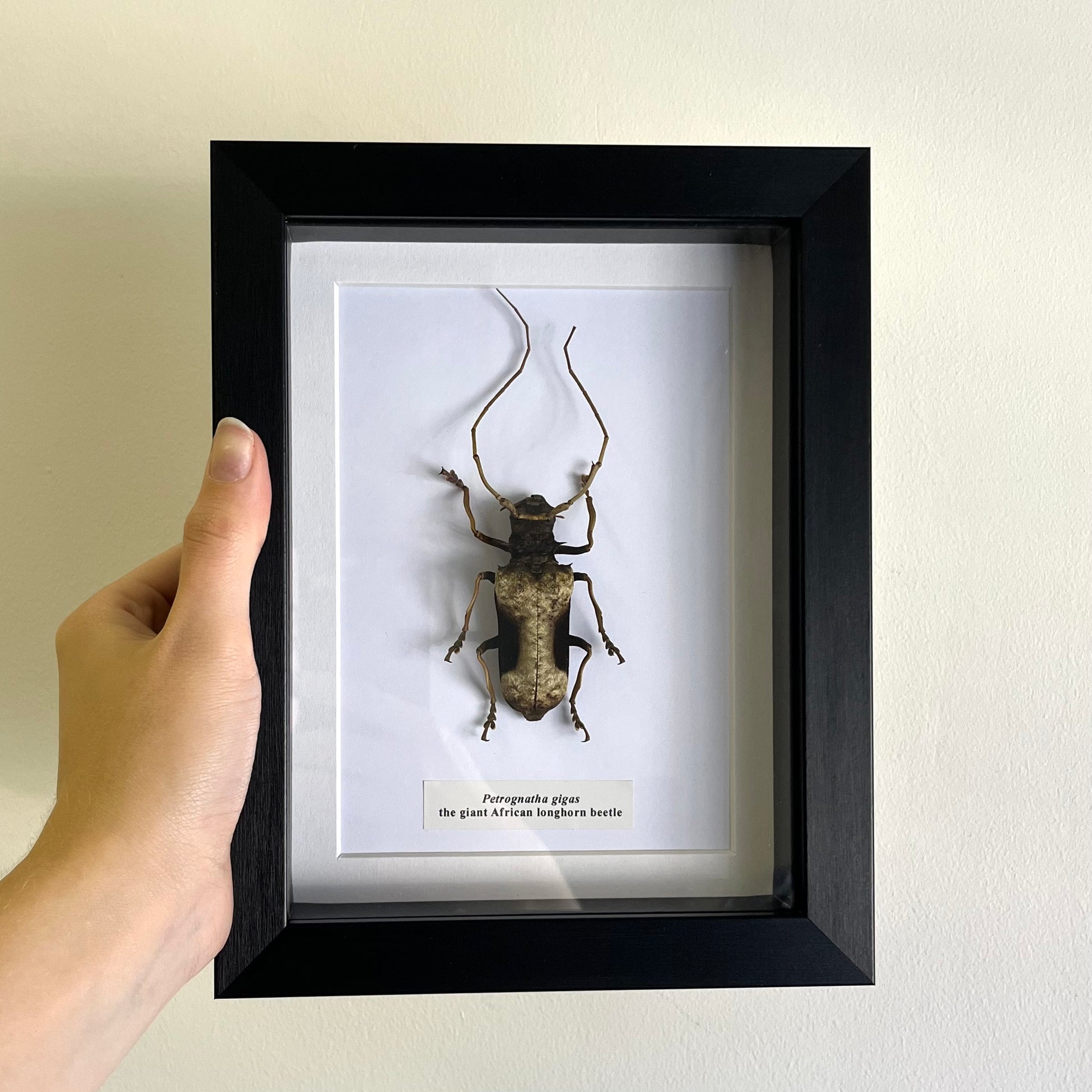 The species is pinned and preserved in a 18x 23cm black frame a white card background.