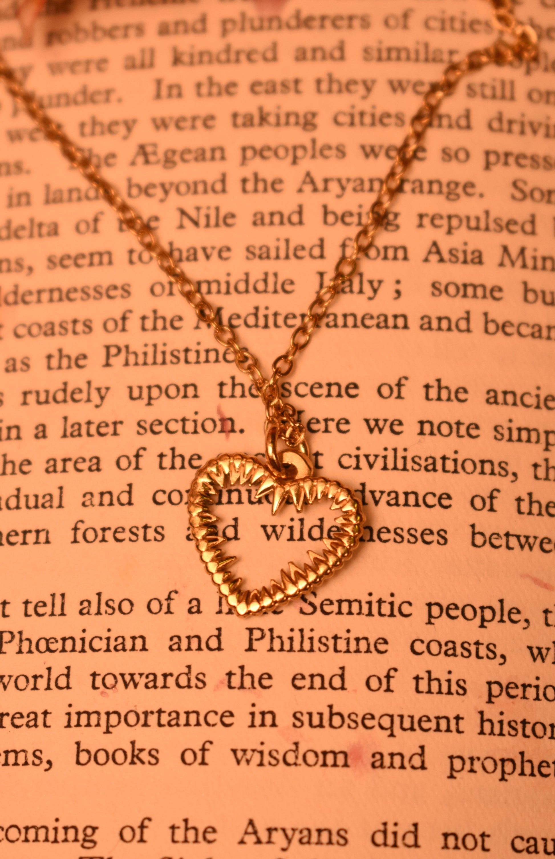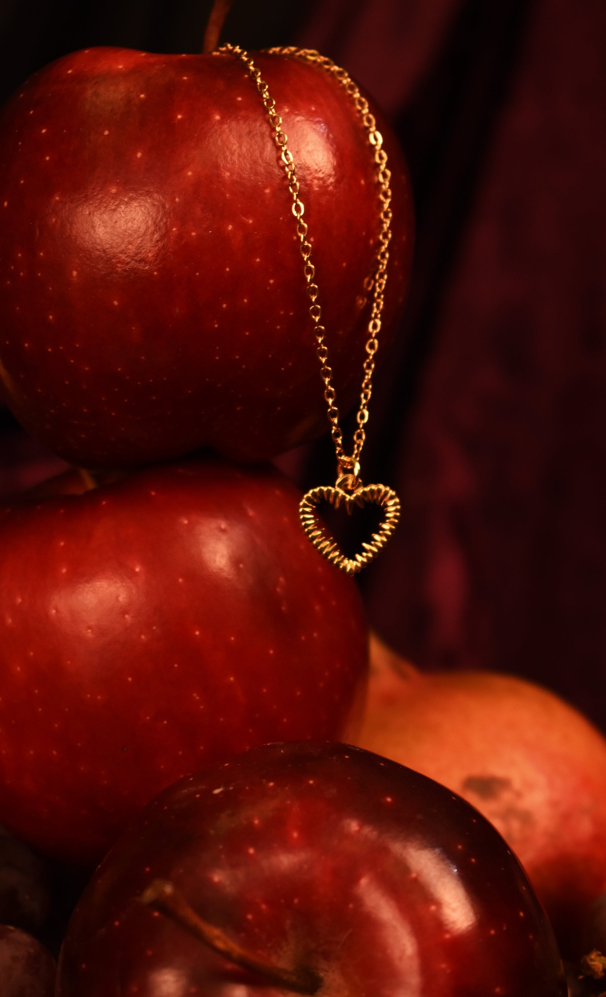 Introducing the Tainted Heart Necklace, a distinctive piece from the Forbidden Love Jewellery Range. This extraordinary necklace features a hollow gold heart pendant adorned with delicate, yet striking spikes on the inside, symbolizing the blend of beauty and complexity that defines love.